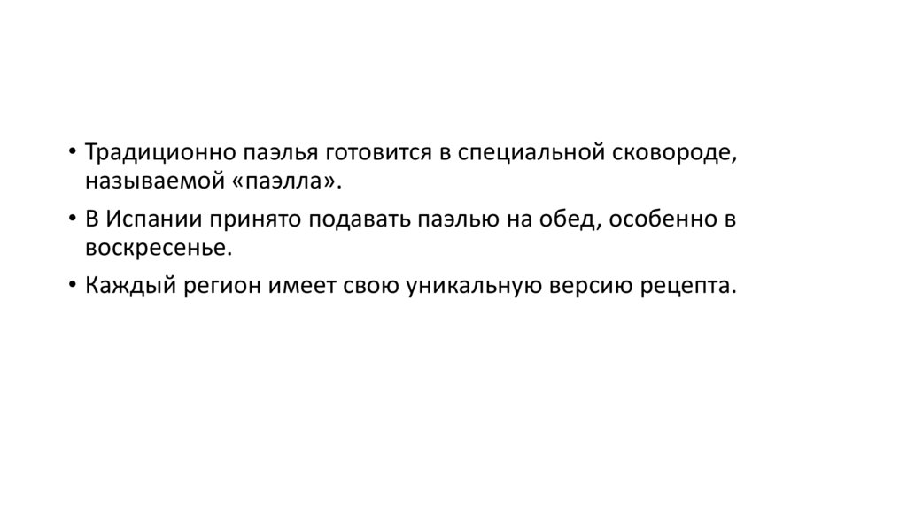 • Традиционно паэлья готовится в специальной сковороде,называемой «паэлла».