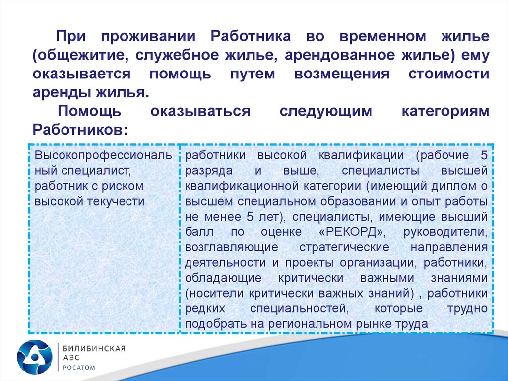 При проживании Работника во временном жилье(общежитие, служебное жилье, арендованное жилье) ему