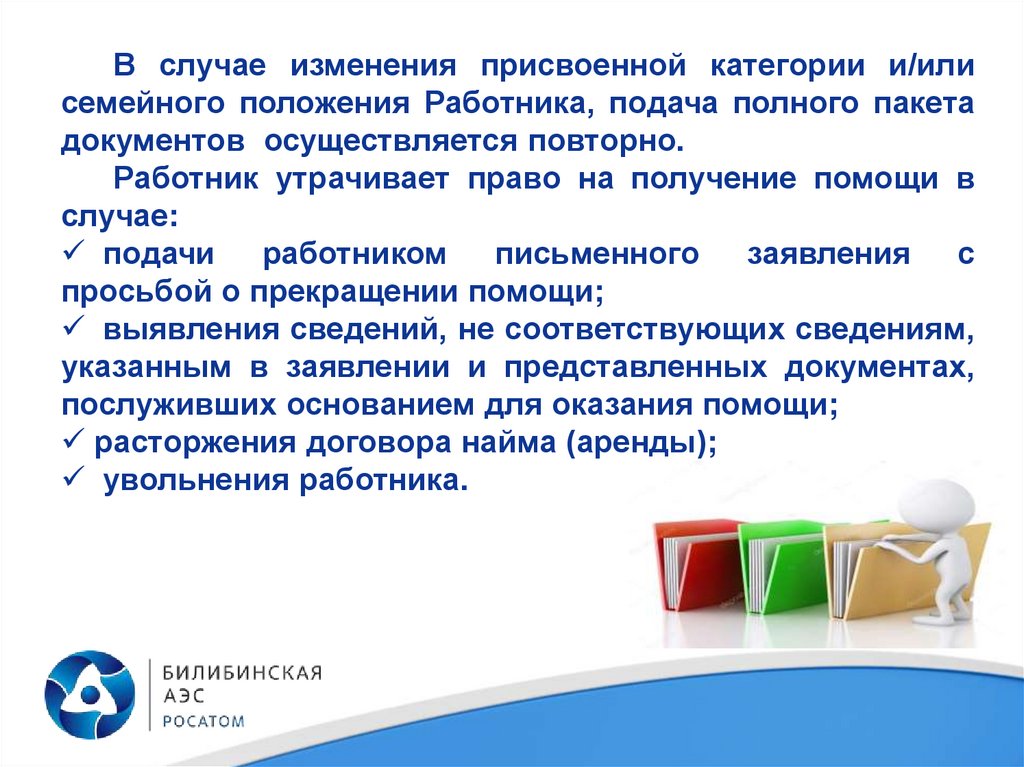 В случае изменения присвоенной категории и/илисемейного положения Работника, подача полного пакета