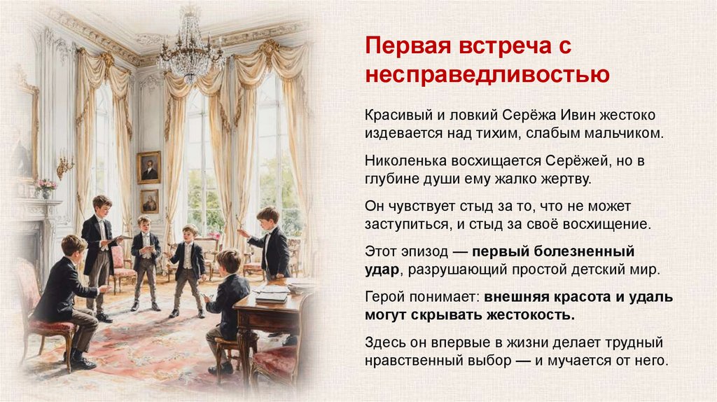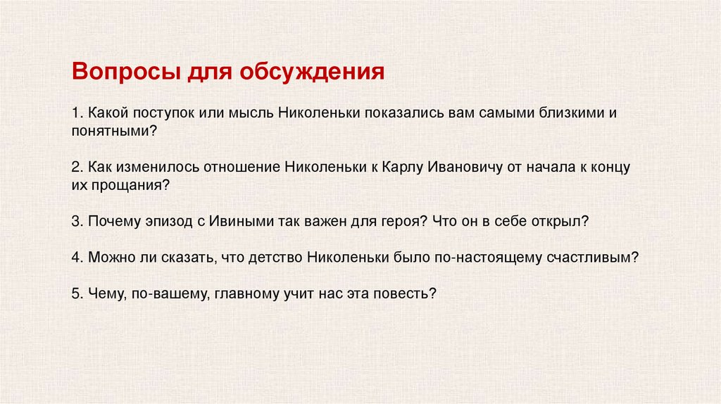Вопросы для обсуждения1. Какой поступок или мысль Николеньки показались вам самыми близкими и