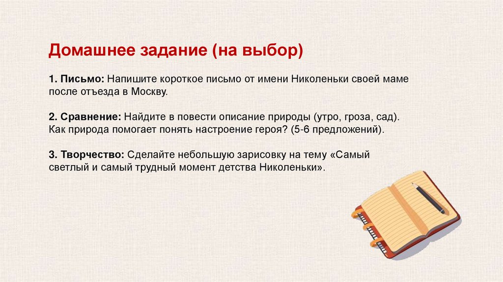 Домашнее задание (на выбор)1. Письмо: Напишите короткое письмо от имени Николеньки своей маме