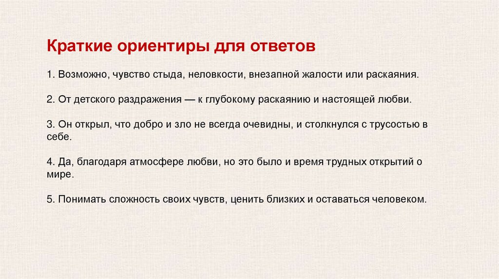 Краткие ориентиры для ответов1. Возможно, чувство стыда, неловкости, внезапной жалости или раскаяния.