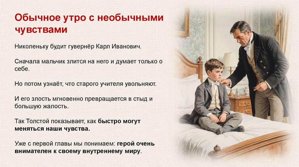 Николеньку будит гувернёр Карл Иванович.