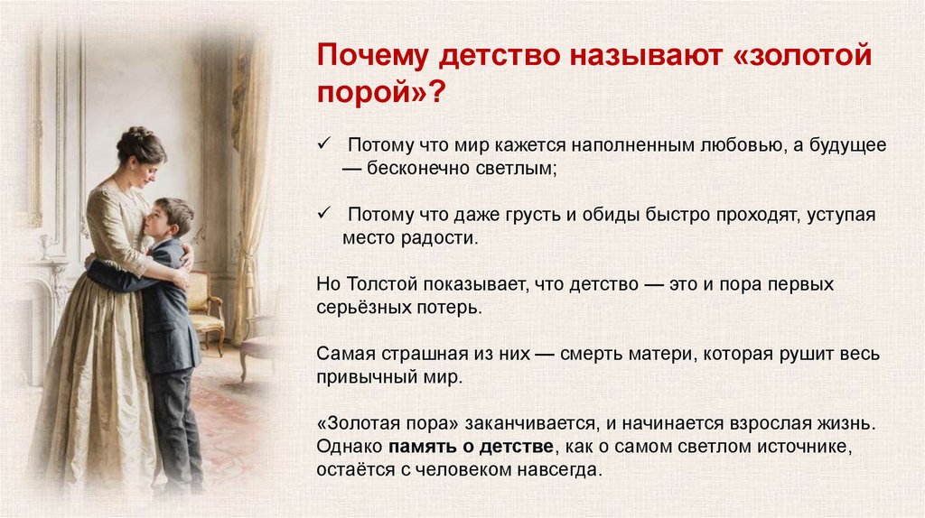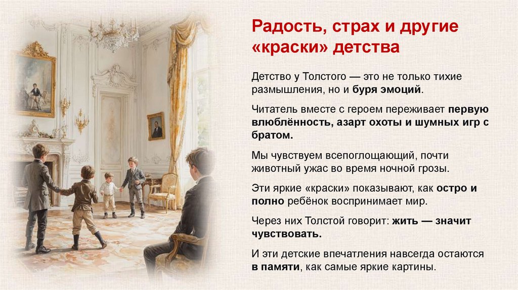 Но Толстой показывает, что детство — это и пора первых
