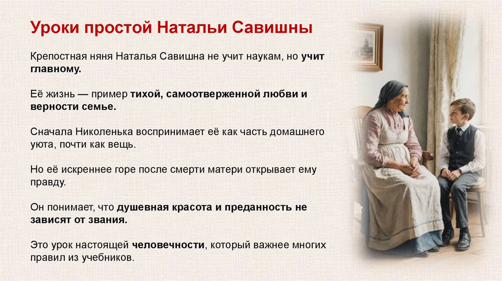 Уроки простой Натальи СавишныКрепостная няня Наталья Савишна не учит наукам, но учит