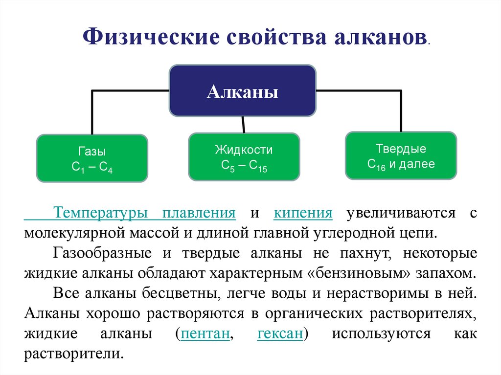 жидкие алканы обладают характерным «бензиновым» запахом.