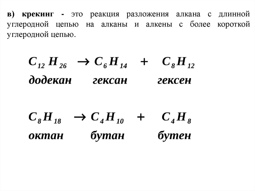 в) крекинг - это реакция разложения алкана с длиннойуглеродной цепью на алканы и алкены с более короткой
