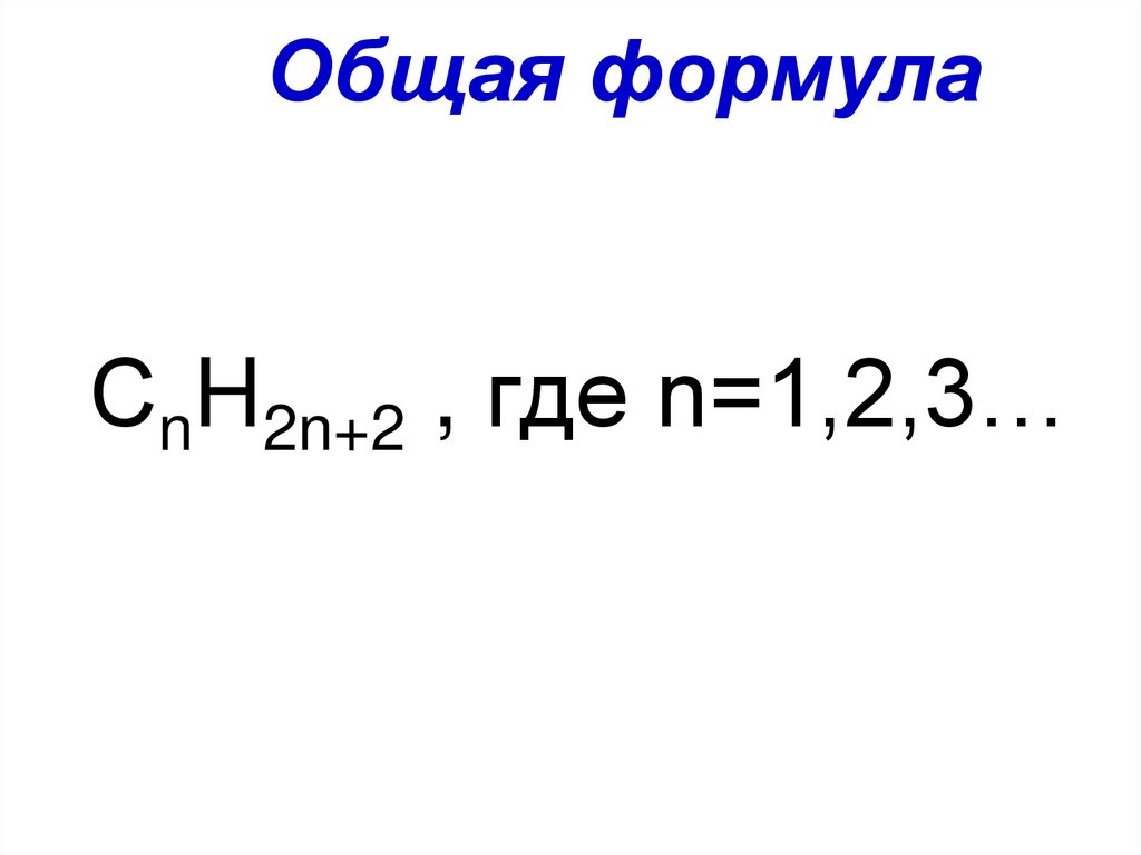 Общая формулаСnH2n+2 , где n=1,2,3…