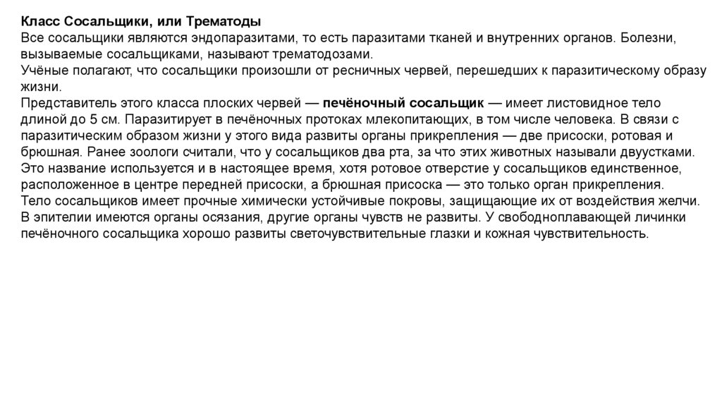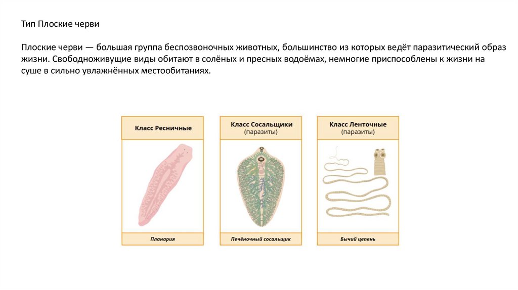 Тип Плоские червиПлоские черви — большая группа беспозвоночных животных, большинство из которых ведёт паразитический образ