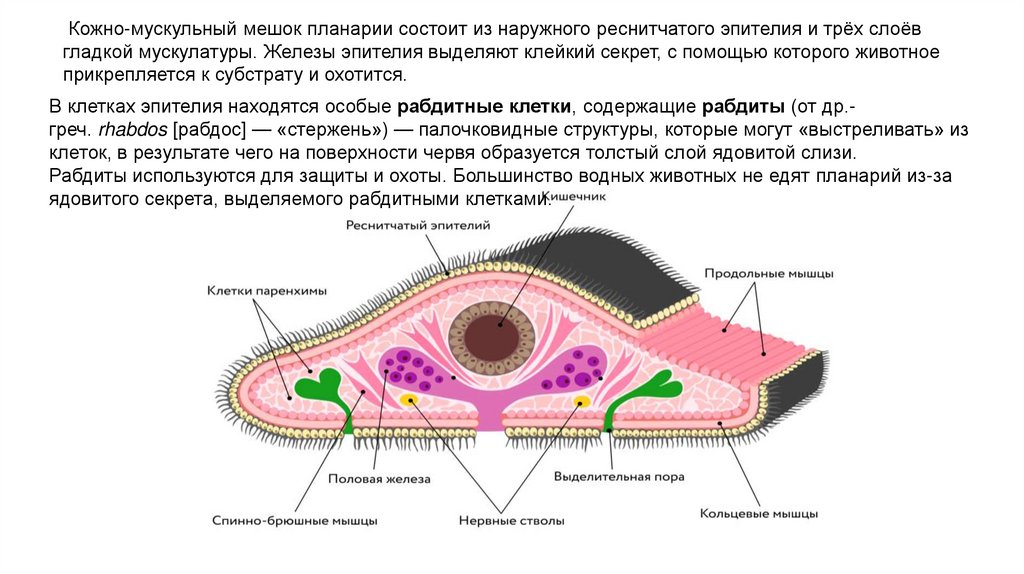 Кожно-мускульный мешок планарии состоит из наружного реснитчатого эпителия и трёх слоёвгладкой мускулатуры. Железы эпителия выделяют клейкий секрет, с помощью которого животное