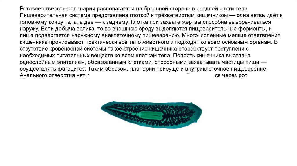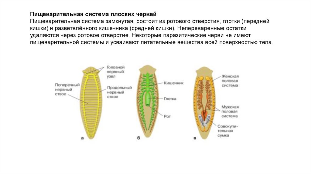 Пищеварительная система плоских червейПищеварительная система замкнутая, состоит из ротового отверстия, глотки (передней