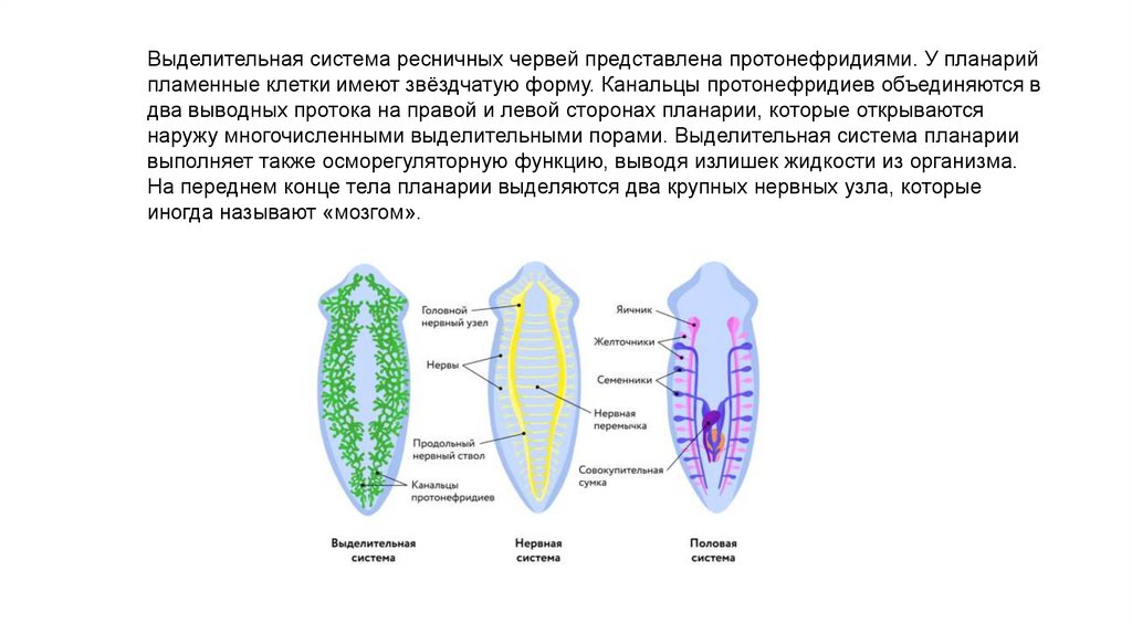 Выделительная система плоских червейВыделительная система представлена ветвящимися в паренхиме парными тонкими каналами,