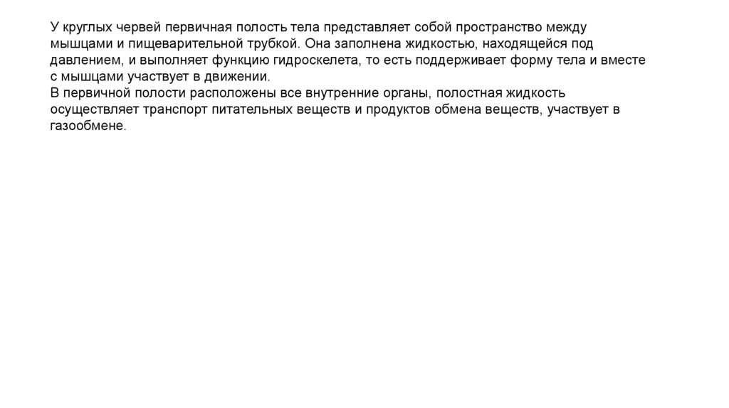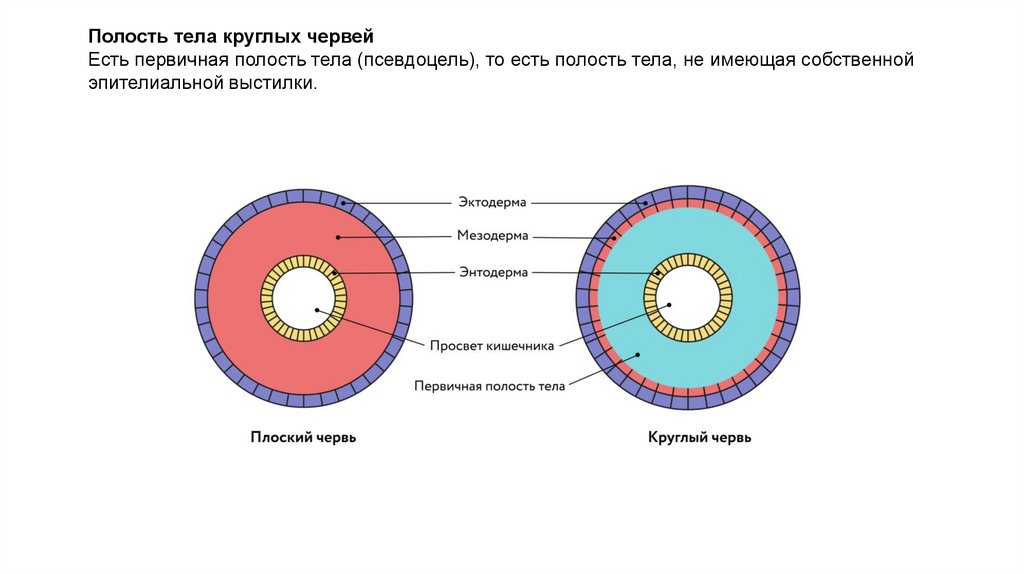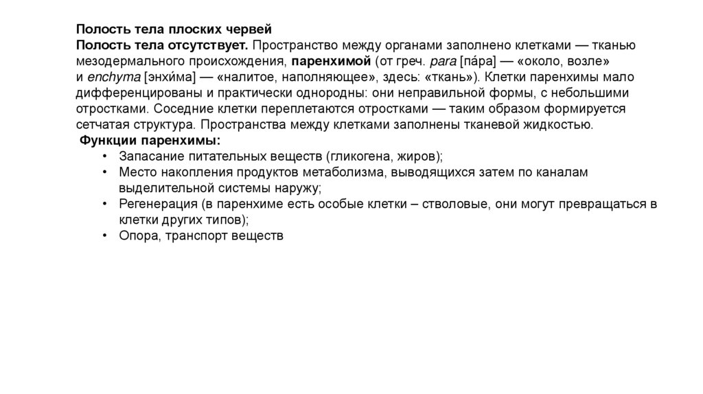 Полость тела плоских червейПолость тела отсутствует. Пространство между органами заполнено клетками — тканью