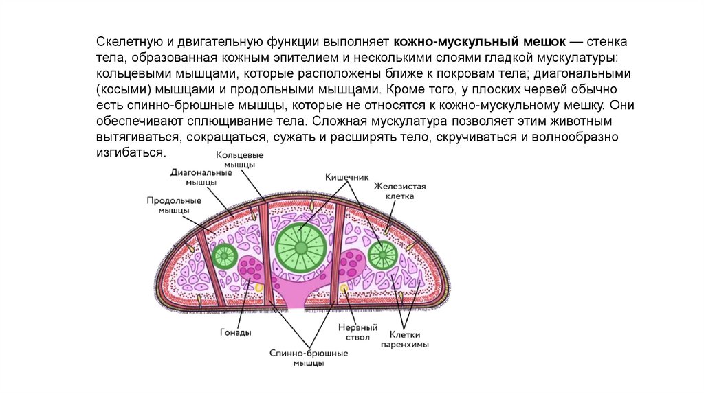 (косыми) мышцами и продольными мышцами. Кроме того, у плоских червей обычно
