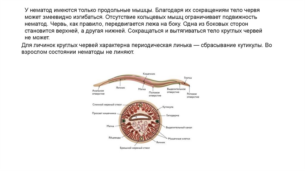 прочной кутикуле и внутриполостному давлению тело аскариды напряжено как струна. Опираясь на