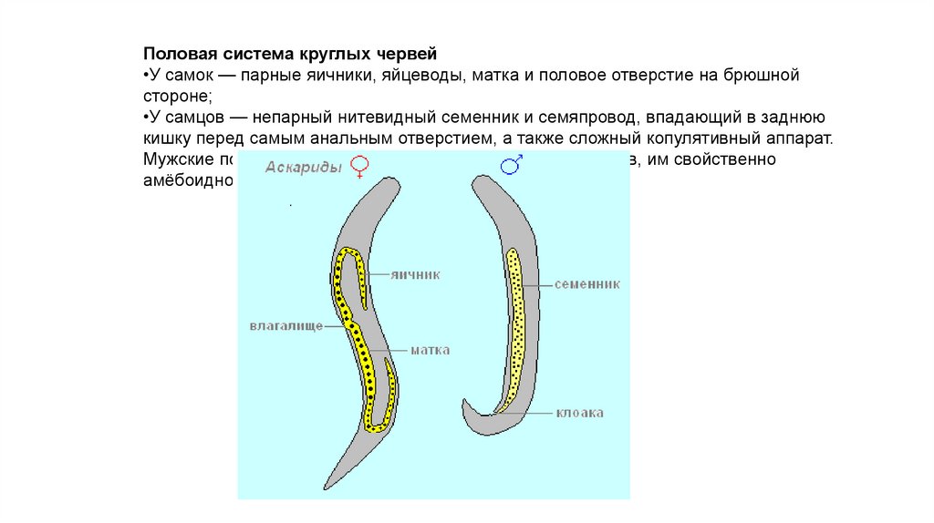 Половая система круглых червей•У самок — парные яичники, яйцеводы, матка и половое отверстие на брюшной