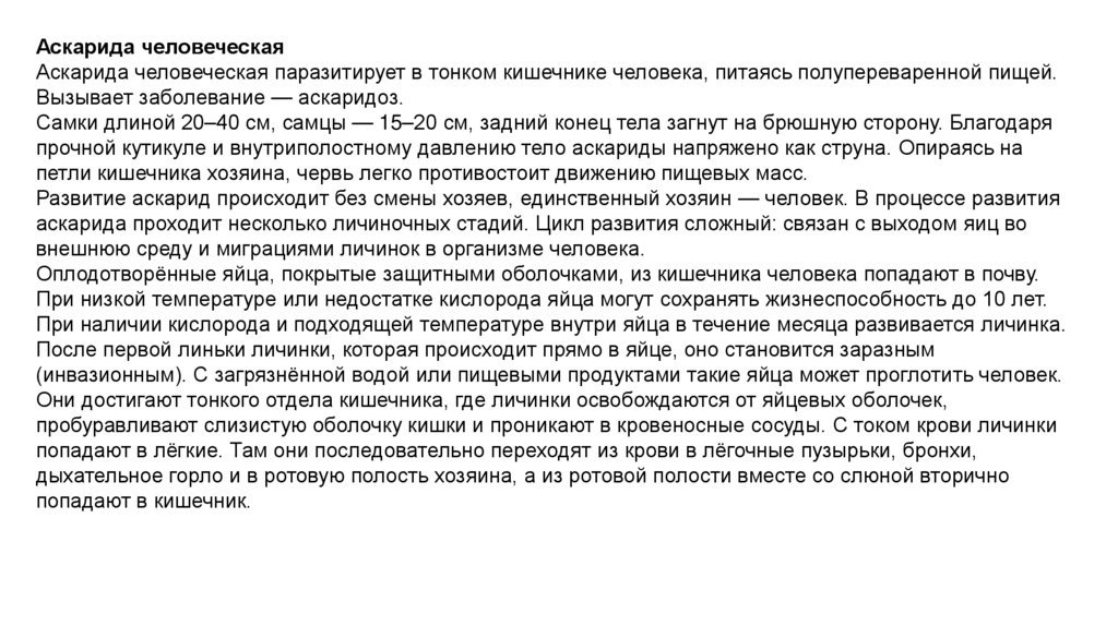 Развитие аскарид происходит без смены хозяев, единственный хозяин — человек. В процессе развития