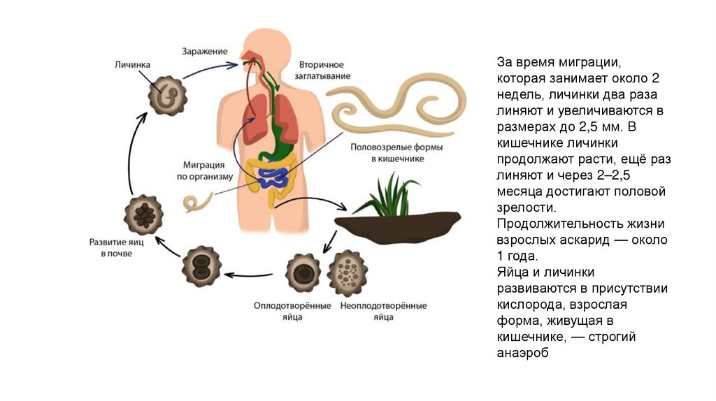 аскарида проходит несколько личиночных стадий. Цикл развития сложный: связан с выходом яиц во