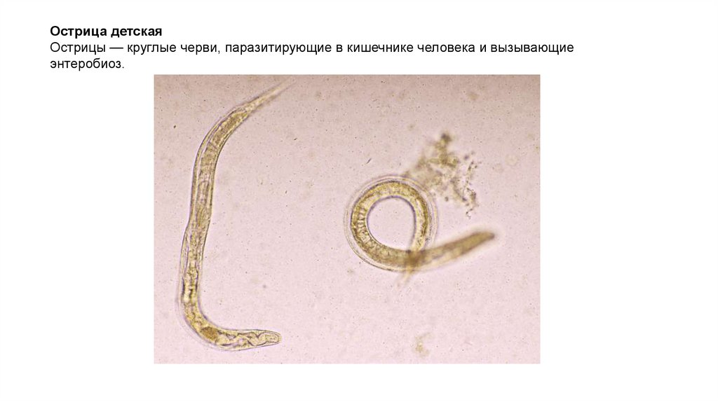 Острица детскаяОстрицы — круглые черви, паразитирующие в кишечнике человека и вызывающие