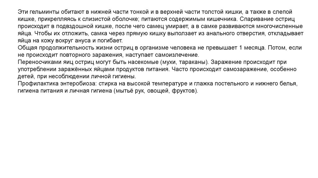 Общая продолжительность жизни остриц в организме человека не превышает 1 месяца. Потом, если