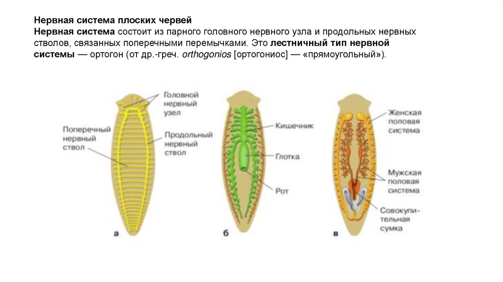 Нервная система плоских червейНервная система состоит из парного головного нервного узла и продольных нервных