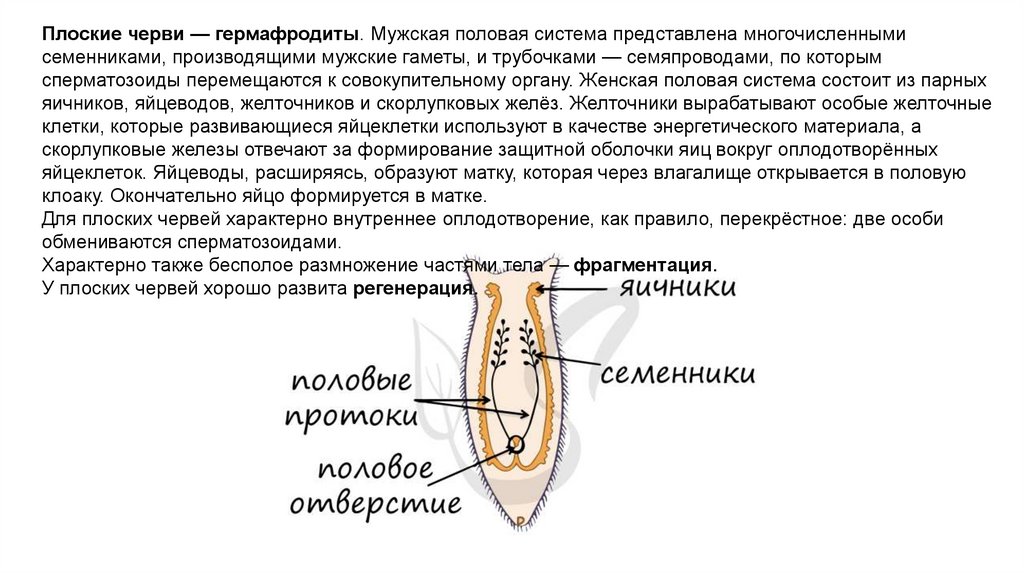 Плоские черви — гермафродиты. Мужская половая система представлена многочисленнымисеменниками, производящими мужские гаметы, и трубочками — семяпроводами, по которым