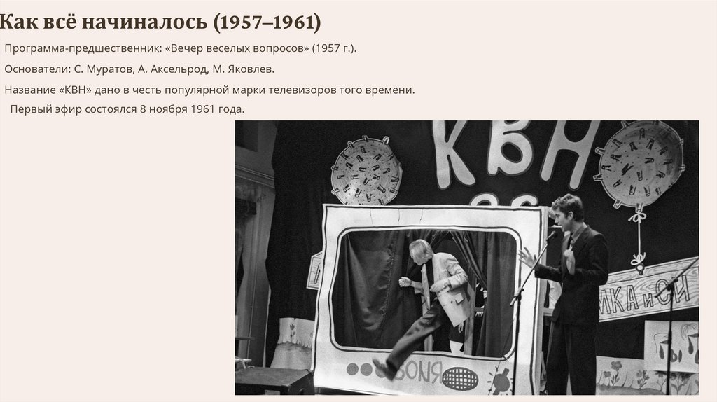 Название «КВН» дано в честь популярной марки телевизоров того времени.