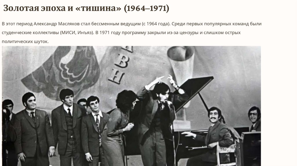 Золотая эпоха и «тишина» (1964–1971)В этот период Александр Масляков стал бессменным ведущим (с 1964 года). Среди первых популярных команд были
