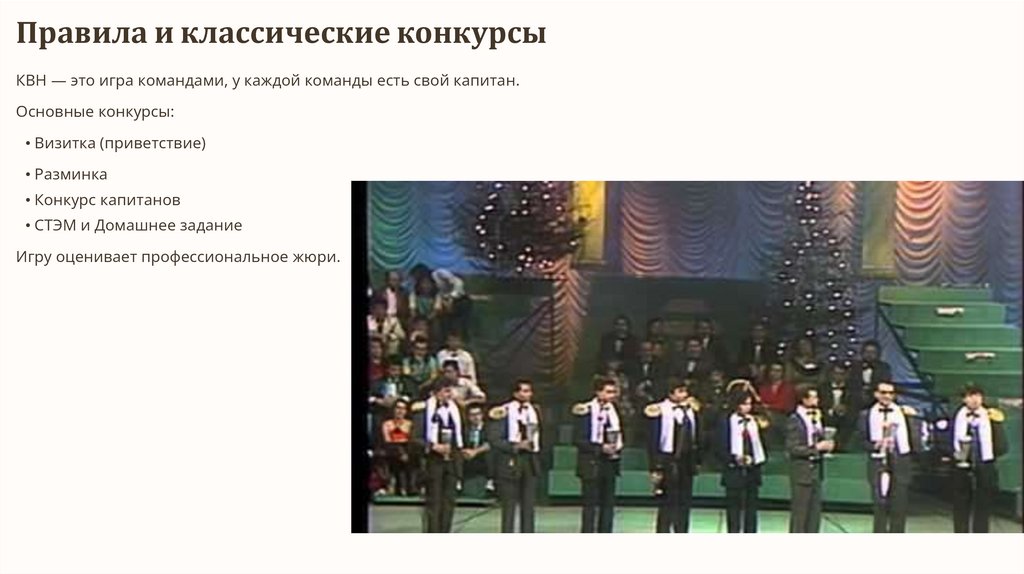 Правила и классические конкурсыКВН — это игра командами, у каждой команды есть свой капитан.