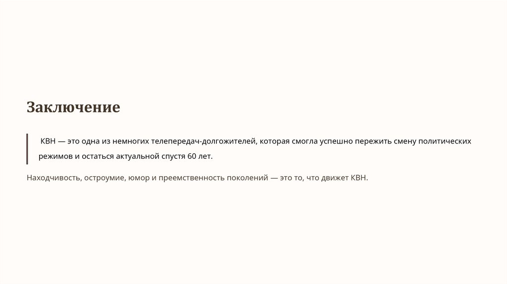 ЗаключениеКВН — это одна из немногих телепередач-долгожителей, которая смогла успешно пережить смену политических