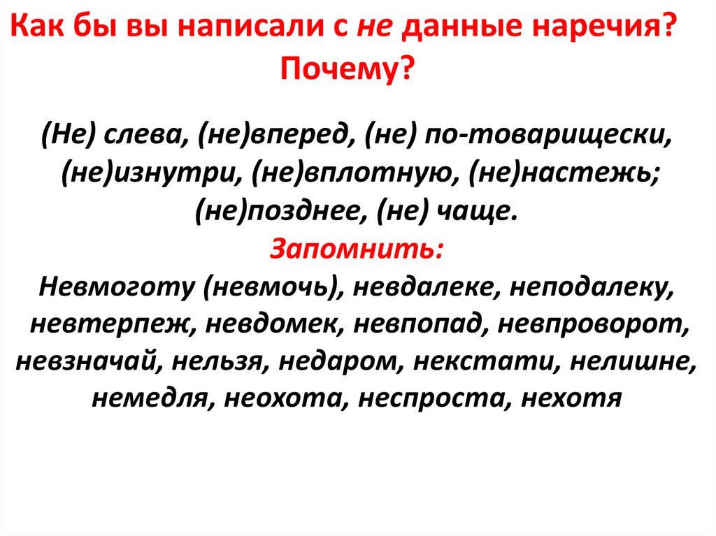 Невмоготу (невмочь), невдалеке, неподалеку,