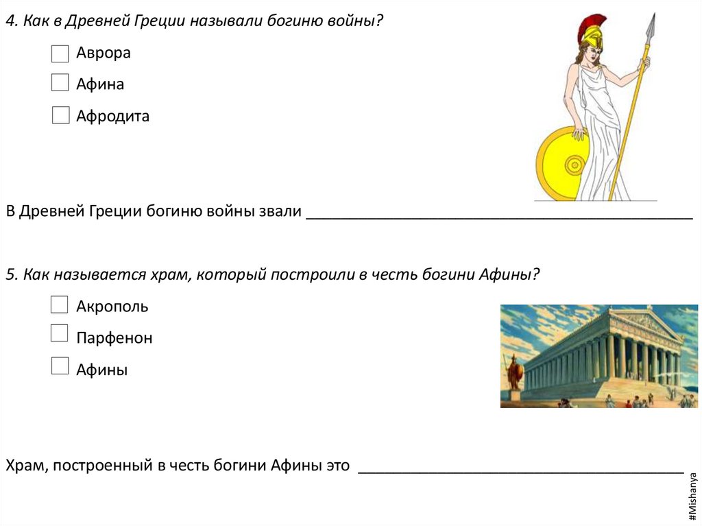 В Древней Греции богиню войны звали ____________________________________________