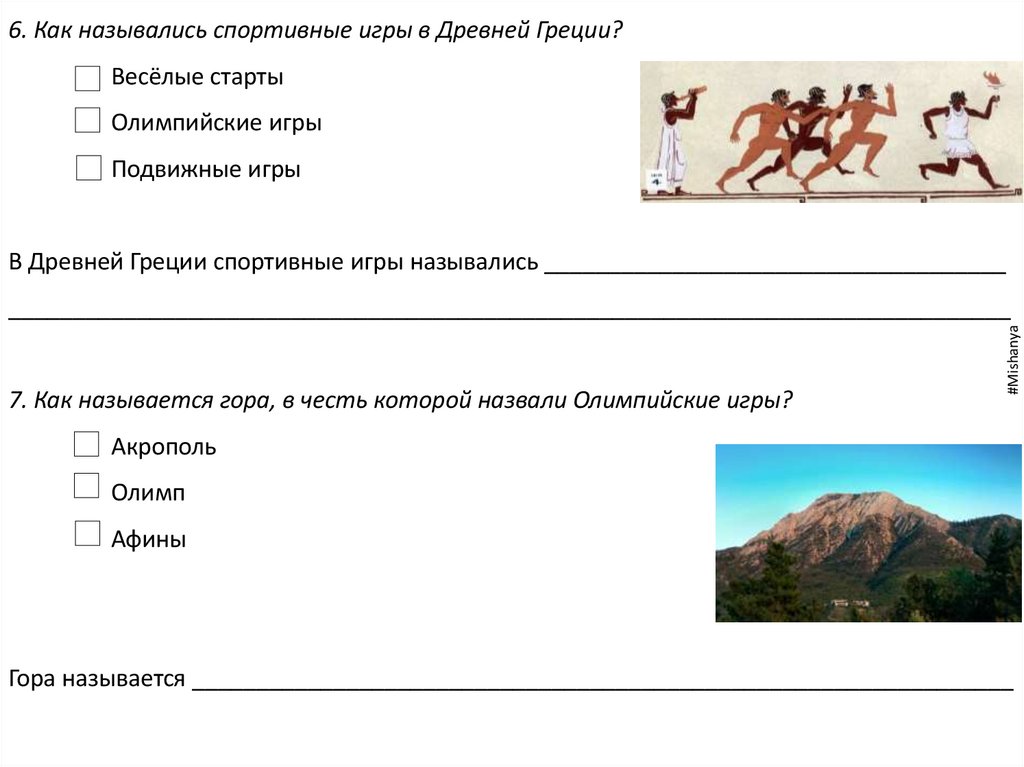 6. Как назывались спортивные игры в Древней Греции?Весёлые старты