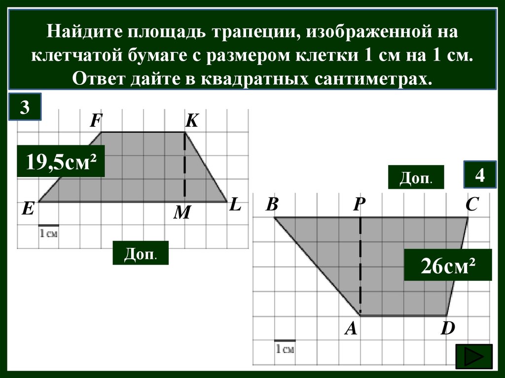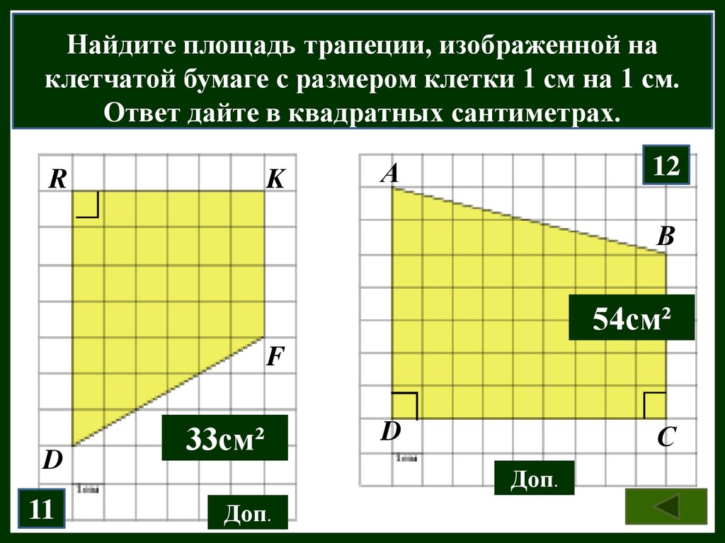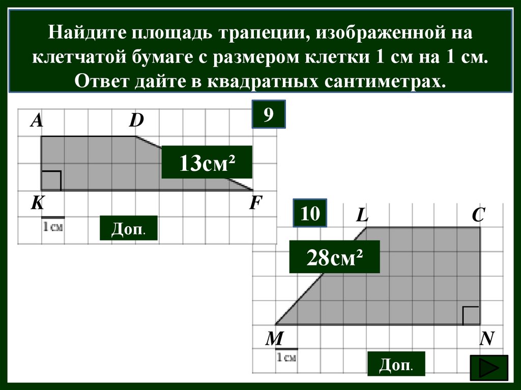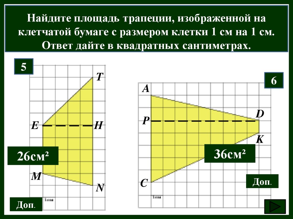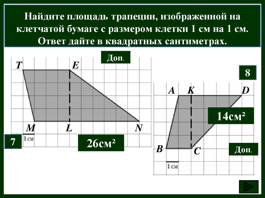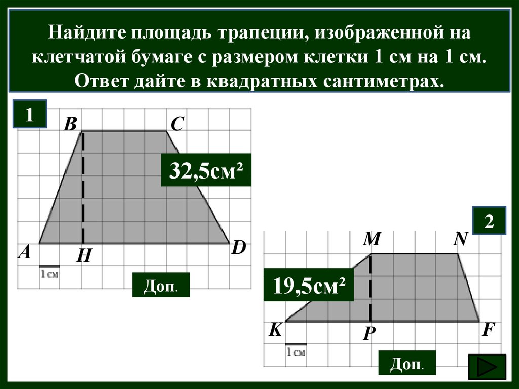 Найдите площадь трапеции, изображенной наклетчатой бумаге с размером клетки 1 см на 1 см.