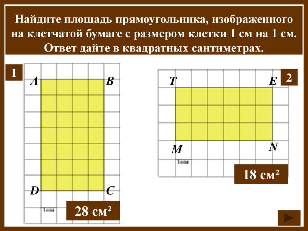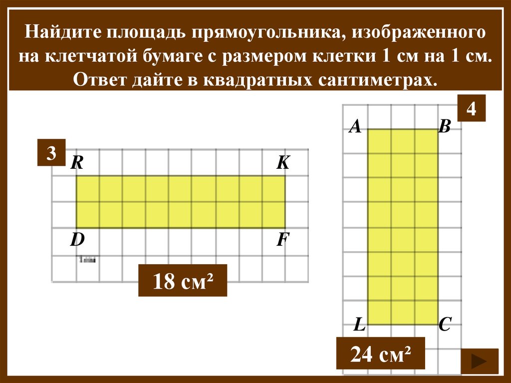 Найдите площадь прямоугольника, изображенногона клетчатой бумаге с размером клетки 1 см на 1 см.