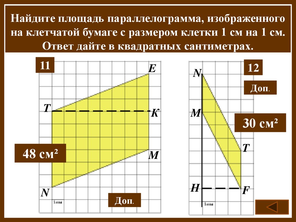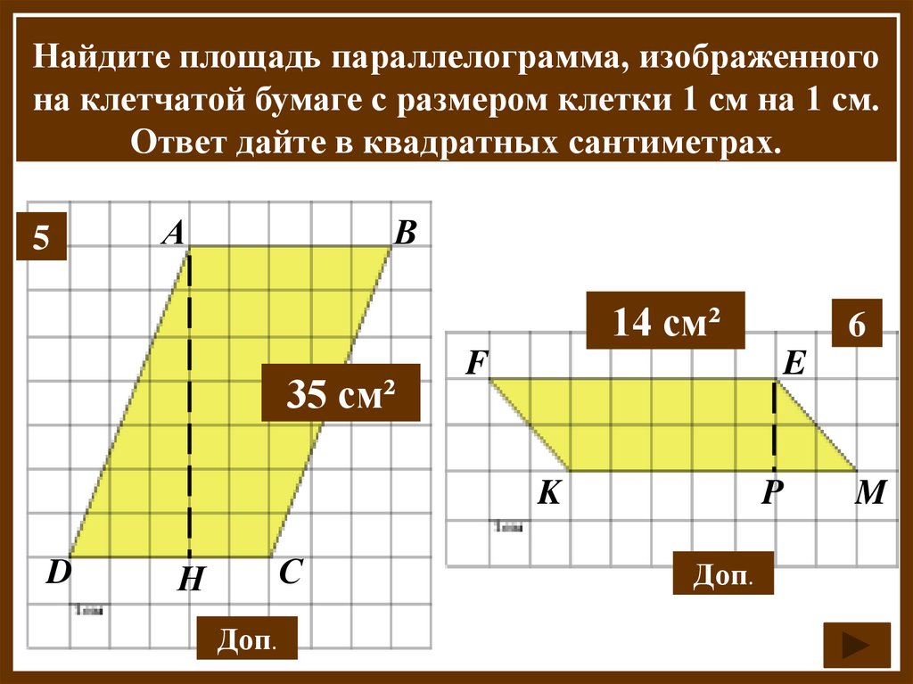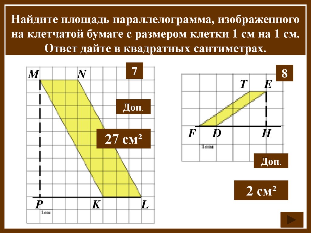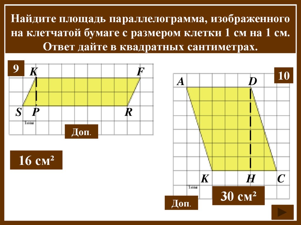 Найдите площадь параллелограмма, изображенногона клетчатой бумаге с размером клетки 1 см на 1 см.