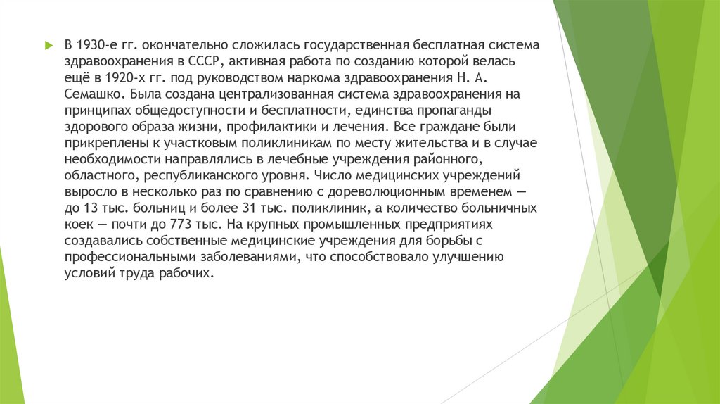 В 1930-е гг. окончательно сложилась государственная бесплатная системаздравоохранения в СССР, активная работа по созданию которой велась