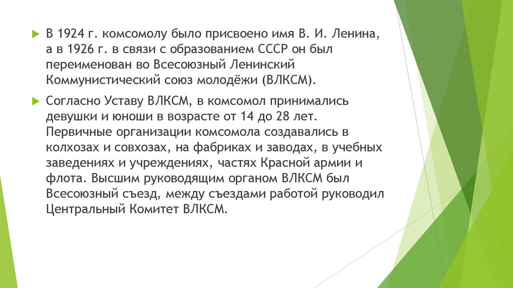 В 1924 г. комсомолу было присвоено имя В. И. Ленина,а в 1926 г. в связи с образованием СССР он был