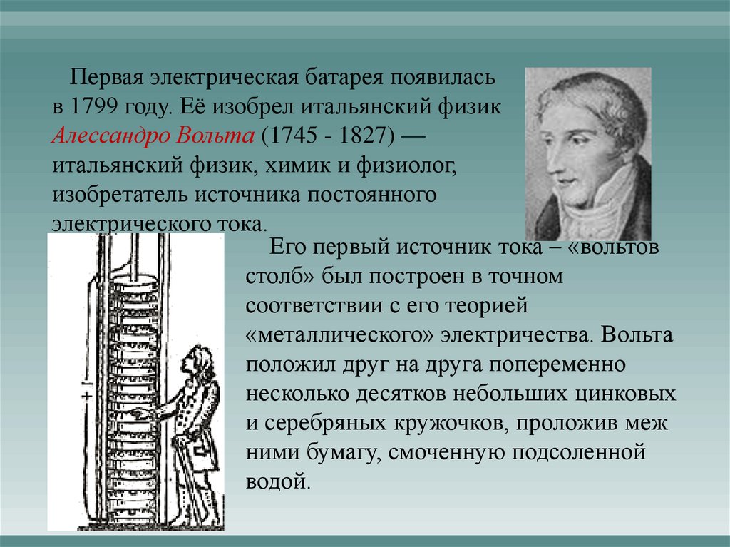 Первая электрическая батарея появиласьв 1799 году. Её изобрел итальянский физик