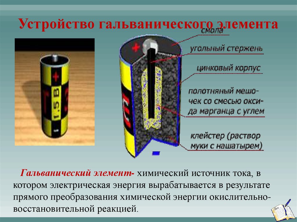Устройство гальванического элементаГальванический элемент- химический источник тока, в