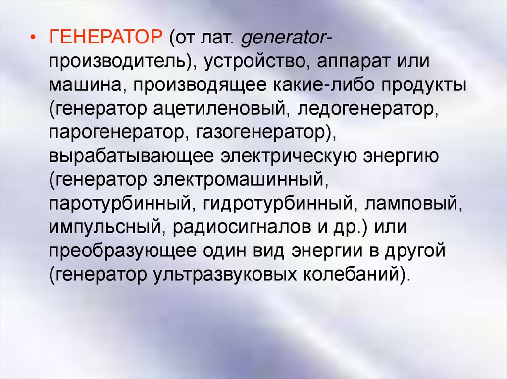 • ГЕНЕРАТОР (от лат. generatorпроизводитель), устройство, аппарат илимашина, производящее какие-либо продукты