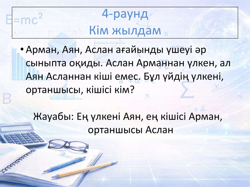 Жауабы: Ең үлкені Аян, ең кішісі Арман,