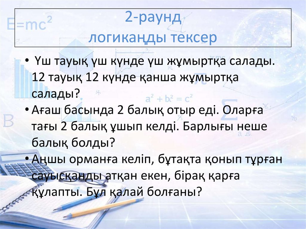 • Үш тауық үш күнде үш жұмыртқа салады.