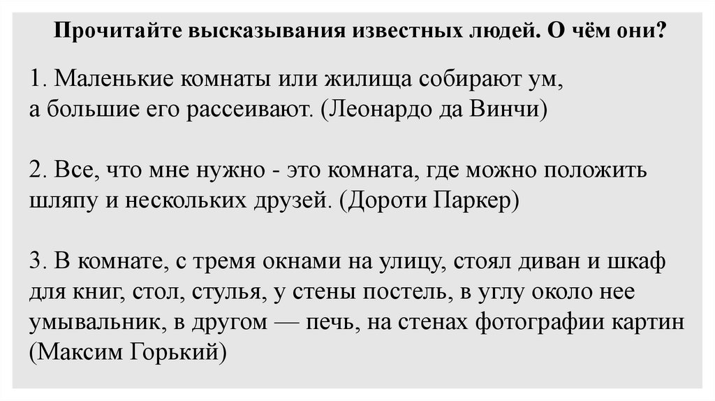 Прочитайте высказывания известных людей. О чём они?1. Маленькие комнаты или жилища собирают ум,