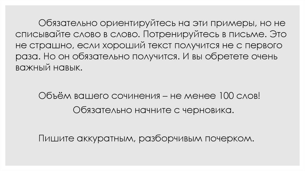 Обязательно ориентируйтесь на эти примеры, но несписывайте слово в слово. Потренируйтесь в письме. Это