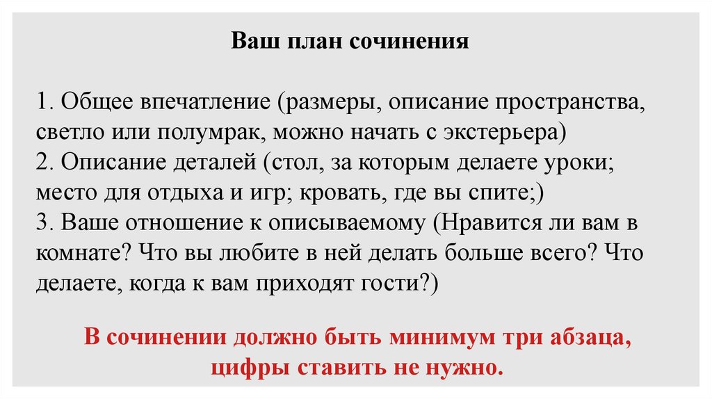 Ваш план сочинения1. Общее впечатление (размеры, описание пространства,