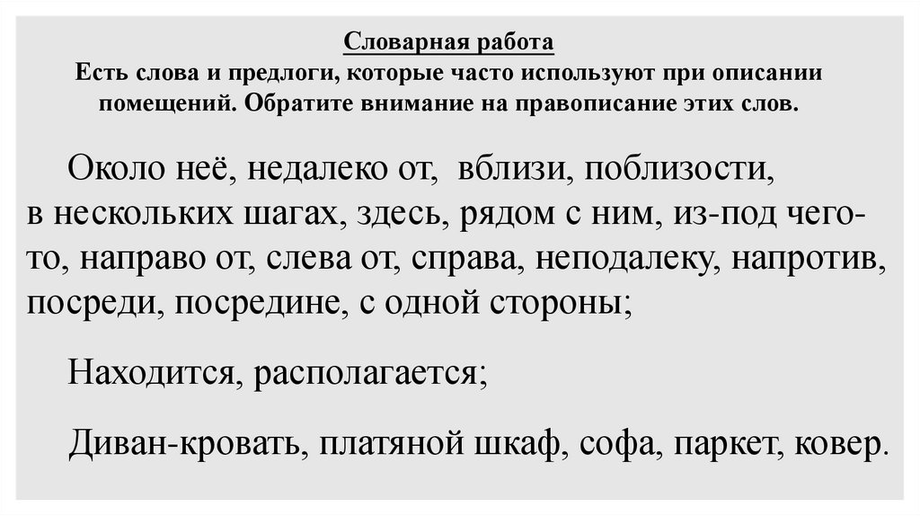 Словарная работаЕсть слова и предлоги, которые часто используют при описании