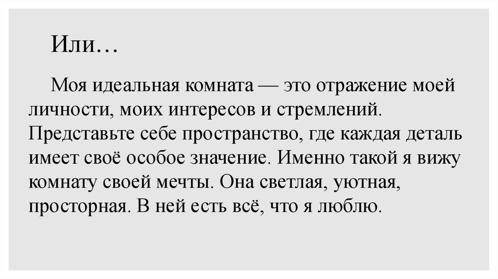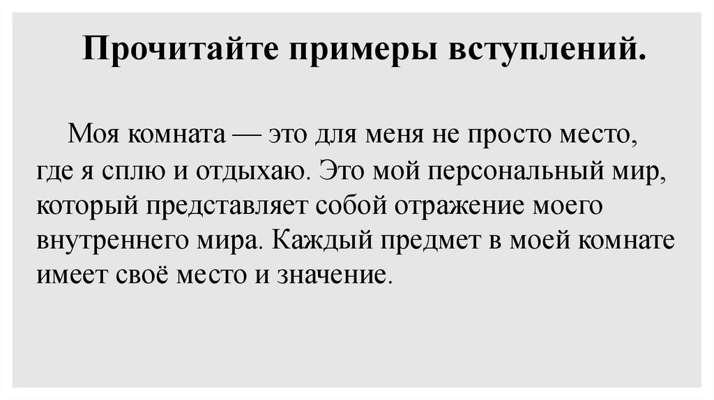 Прочитайте примеры вступлений.Моя комната — это для меня не просто место,