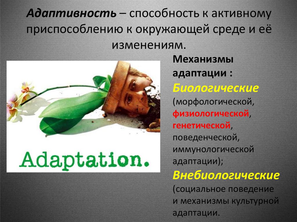 Адаптивность – способность к активномуприспособлению к окружающей среде и её