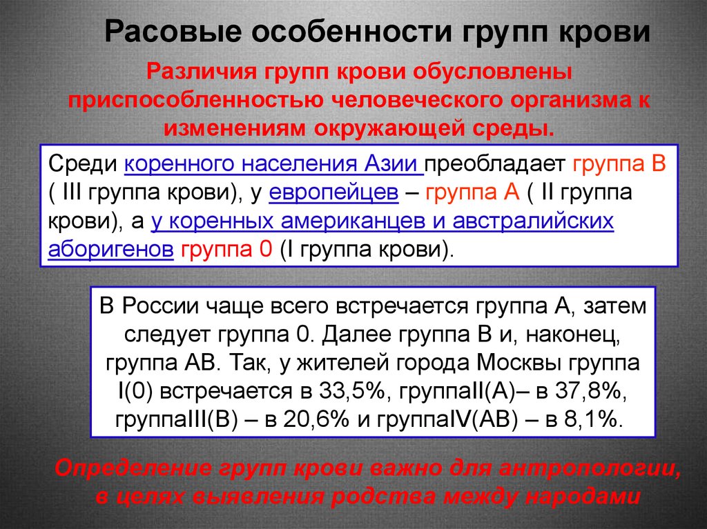 Расовые особенности групп кровиРазличия групп крови обусловлены